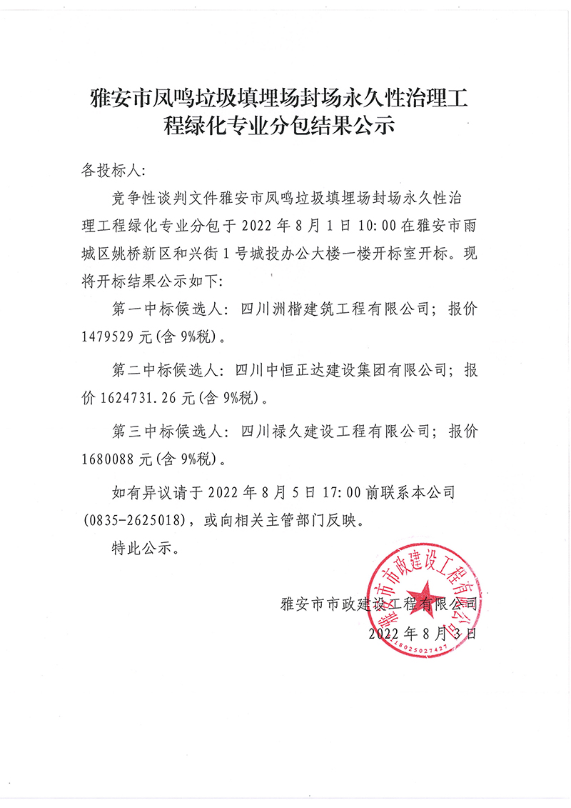 雅安市鳳鳴垃圾填埋場封場永久性治理工程項目綠化專業(yè)分包結果公示