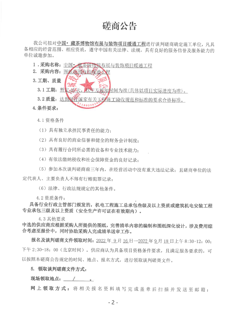 中國(guó)• 藏茶博物館布展與裝飾項(xiàng)目暖通工程談判磋商公告