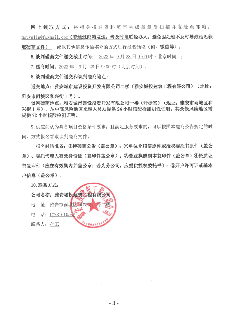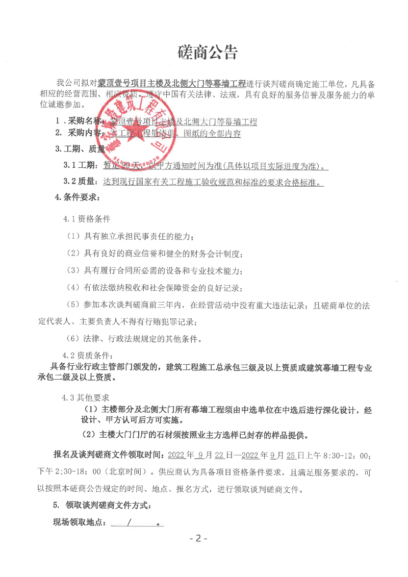 蒙頂壹號項目主樓及北側(cè)大門等幕墻工程談判磋商公告