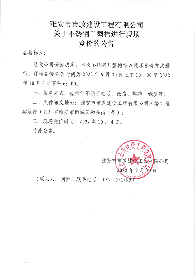關(guān)于不銹鋼U型槽進(jìn)行現(xiàn)場競價(jià)的公告