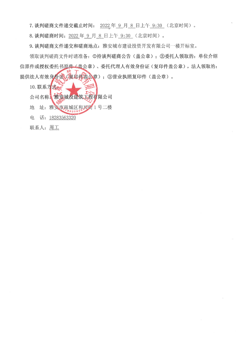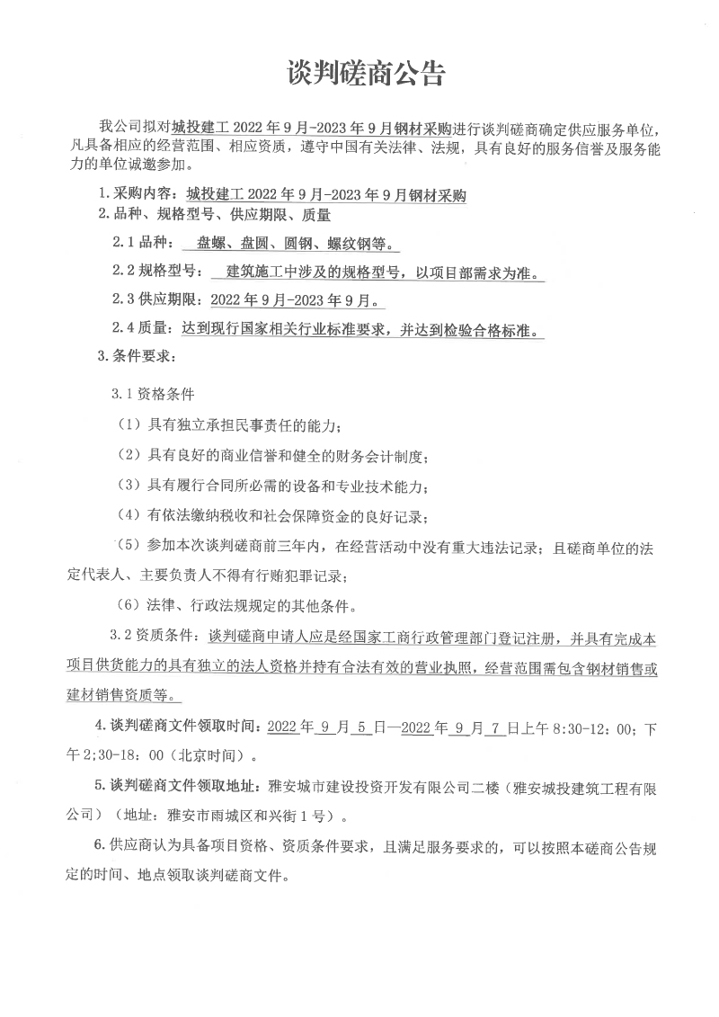 城投建工2022年9月-2023年9月鋼材采購談判磋商公告