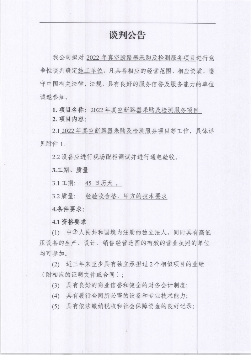 城利水電公司2022年真空斷路器采購及檢測服務(wù)項目競爭性談判公告
