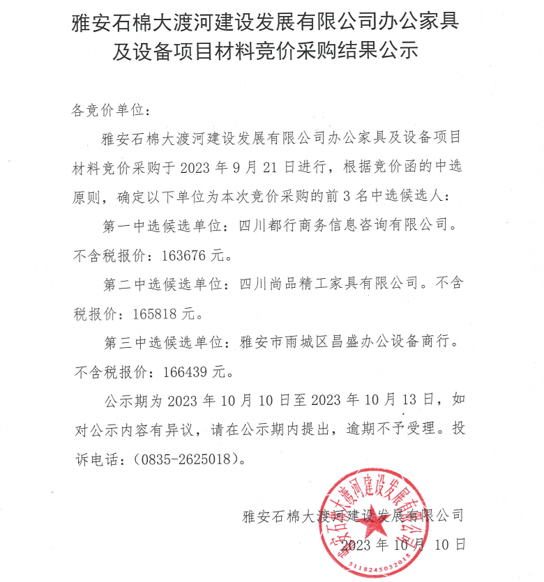 雅安石棉大渡河建設(shè)發(fā)展有限公司辦公家具及設(shè)備項目材料競價采購結(jié)果公示
