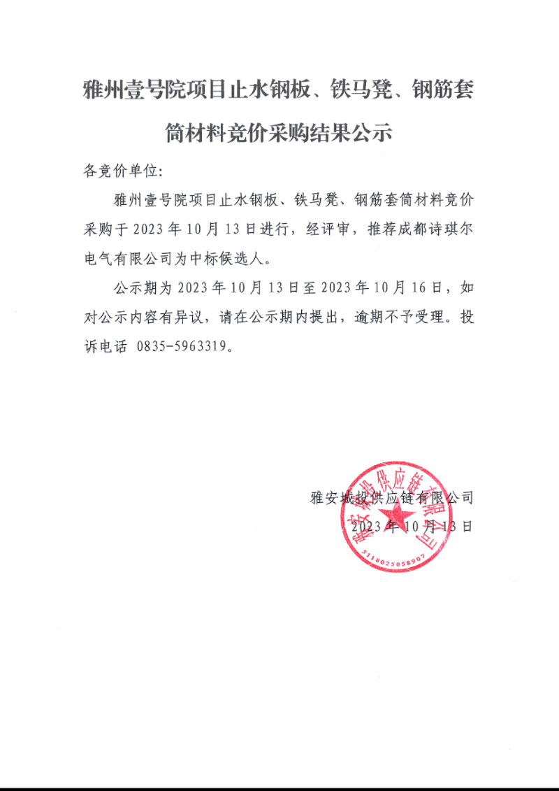 雅州壹號院項目止水鋼板、鐵馬凳、鋼筋套筒材料競價采購結果公示