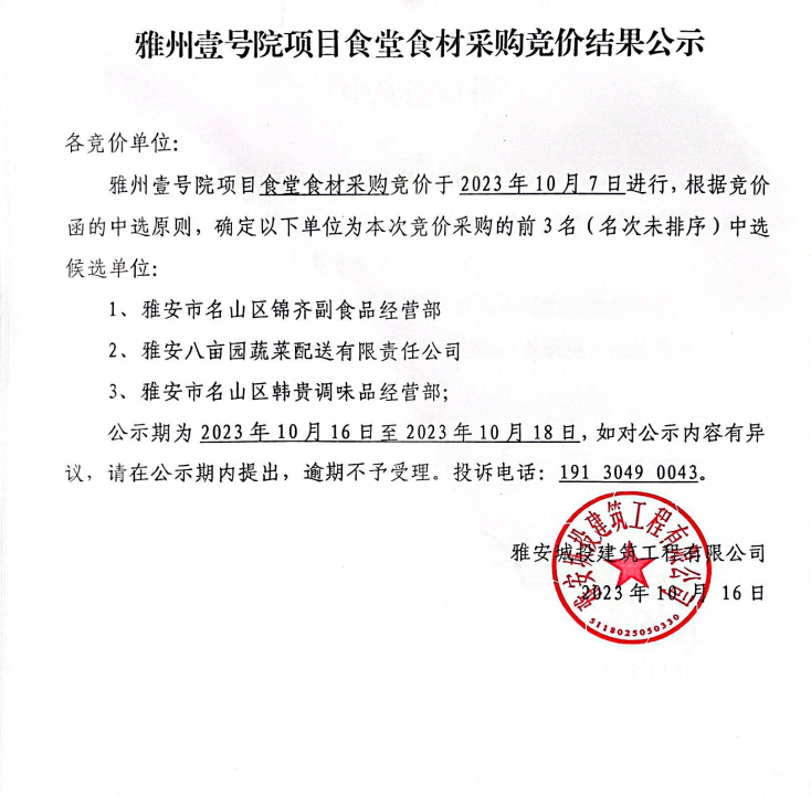 雅州壹號院項目食堂食材采購競價結(jié)果公示