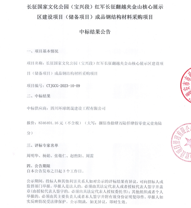長征國家文化公園(寶興段)紅軍長征翻越夾金山核心展示區(qū)建設項目(儲備項目)成品鋼結構材料采購項目中標結果公告
