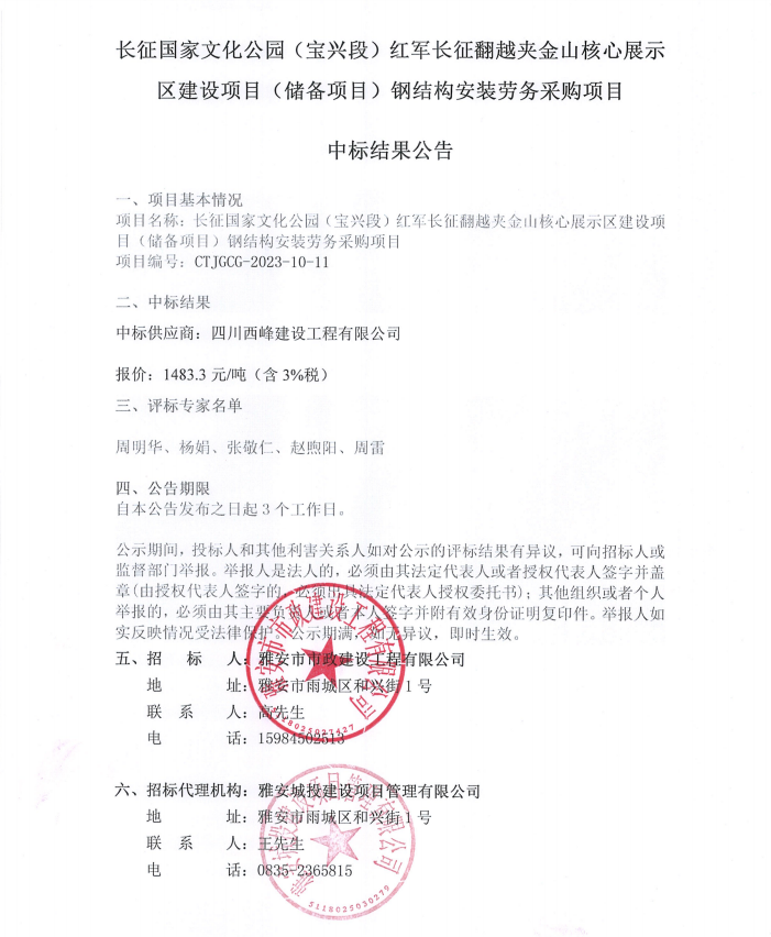 長征國家文化公園(寶興段)紅軍長征翻越夾金山核心展示區(qū)建設項目(儲備項目)鋼結(jié)構(gòu)安裝勞務采購項目中標結(jié)果公告