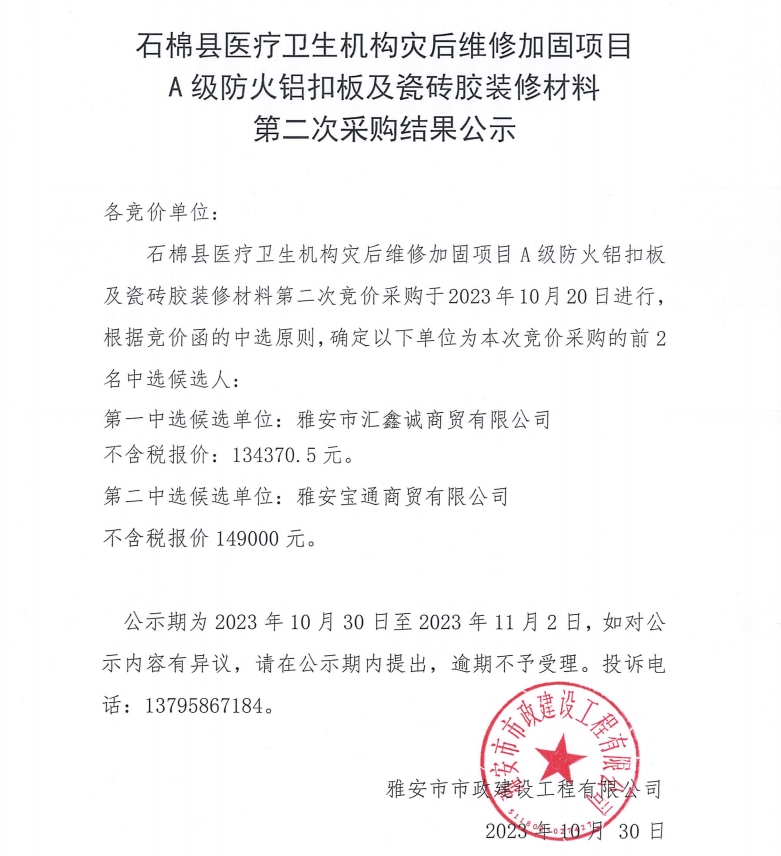石棉縣醫(yī)療衛(wèi)生機構災后維修加固項目A級防火鋁扣板及瓷磚膠裝修材料第二次采購結果公示