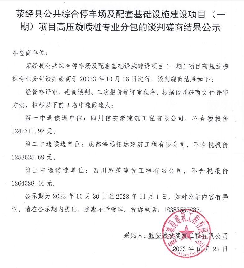 滎經(jīng)縣公共綜合停車(chē)場(chǎng)及配套基礎(chǔ)設(shè)施建設(shè)項(xiàng)目(一期)項(xiàng)目高壓旋噴樁專(zhuān)業(yè)分包的談判磋商結(jié)果公示
