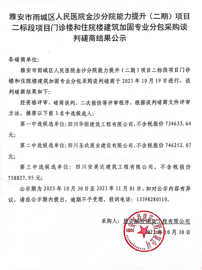 雅安市雨城區(qū)人民醫(yī)院金沙分院能力提升(二期)項(xiàng)目二標(biāo)段門診樓和住院樓建筑加固專業(yè)分包采購談判磋商結(jié)果公示