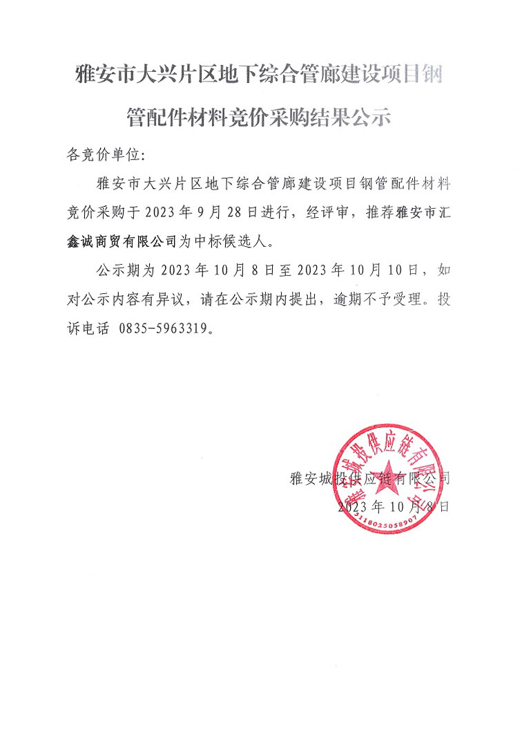 雅安市大興片區(qū)地下綜合管廊建設(shè)項(xiàng)目鋼管配件材料競(jìng)價(jià)采購結(jié)果公示