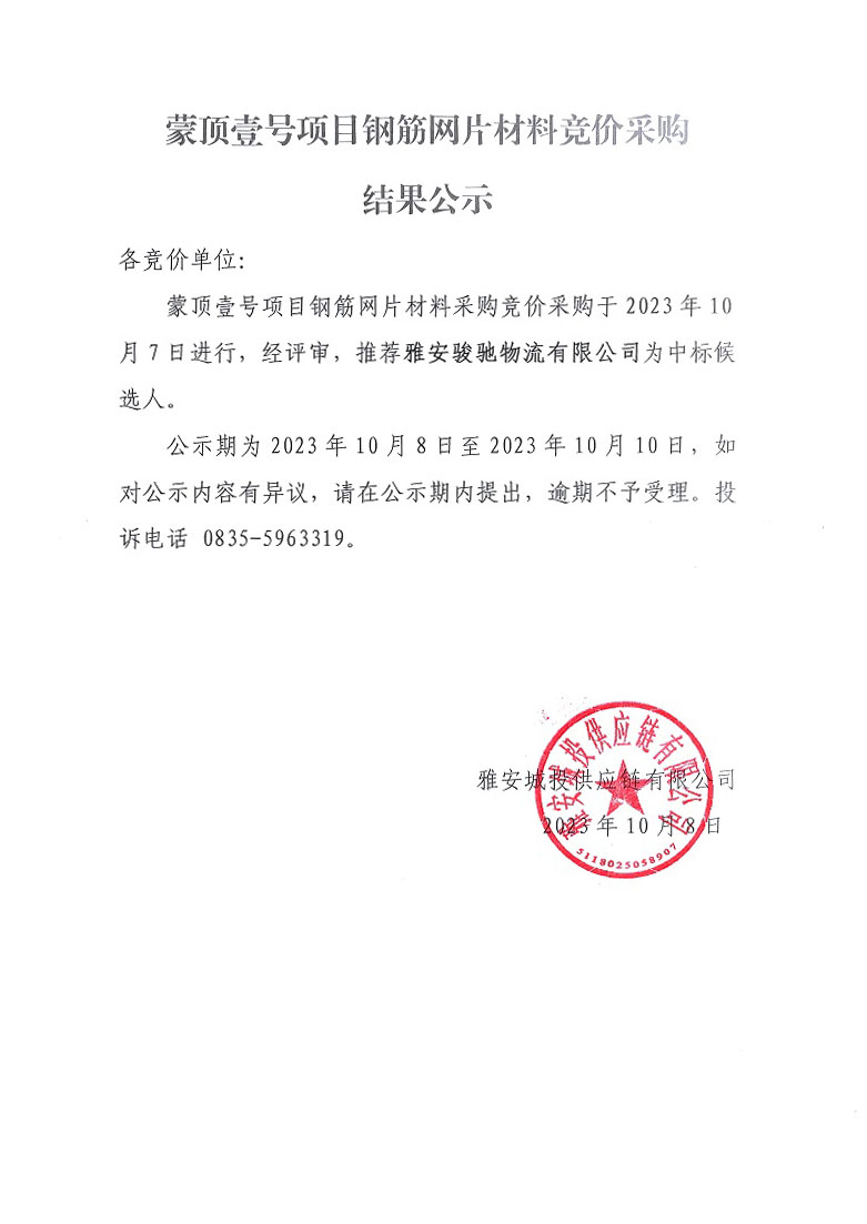 蒙頂壹號(hào)項(xiàng)目鋼筋網(wǎng)片材料競價(jià)采購結(jié)果公示