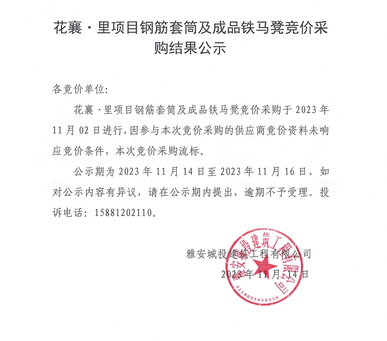 花襄·里鋼筋套筒及成品鐵馬凳競價(jià)采購結(jié)果公示