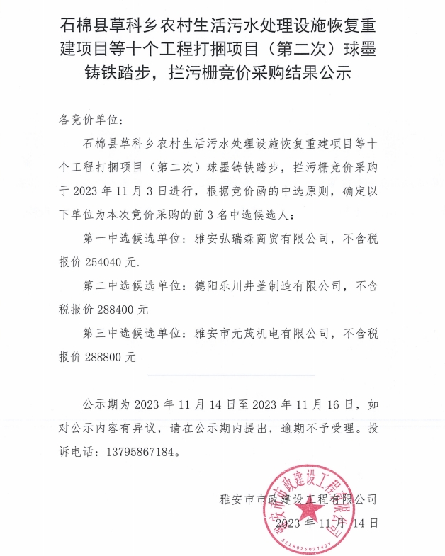 石棉縣草科鄉(xiāng)農(nóng)村生活污水處理設(shè)施恢復(fù)重建項目等十個工程打捆項目(第二次)球墨鑄鐵踏步,攔污柵競價采購結(jié)果公示