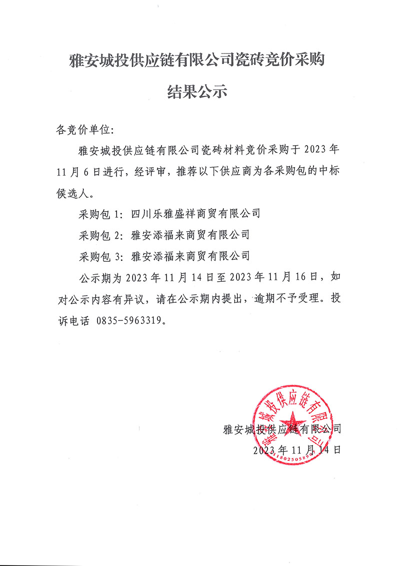 雅安城投供應(yīng)鏈有限公司瓷磚競(jìng)價(jià)采購結(jié)果公示