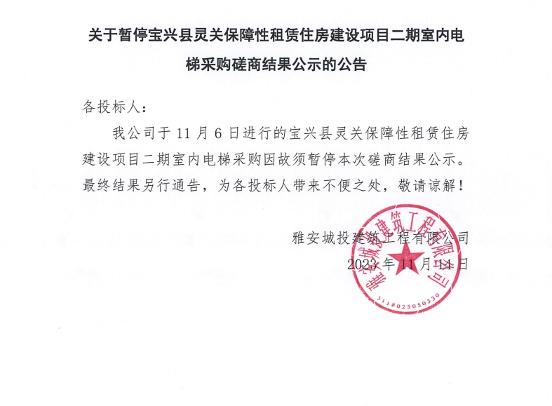 關于暫停寶興縣靈關保障性租賃住房建設項目二期室內(nèi)電梯采購磋商結(jié)果公示的公告