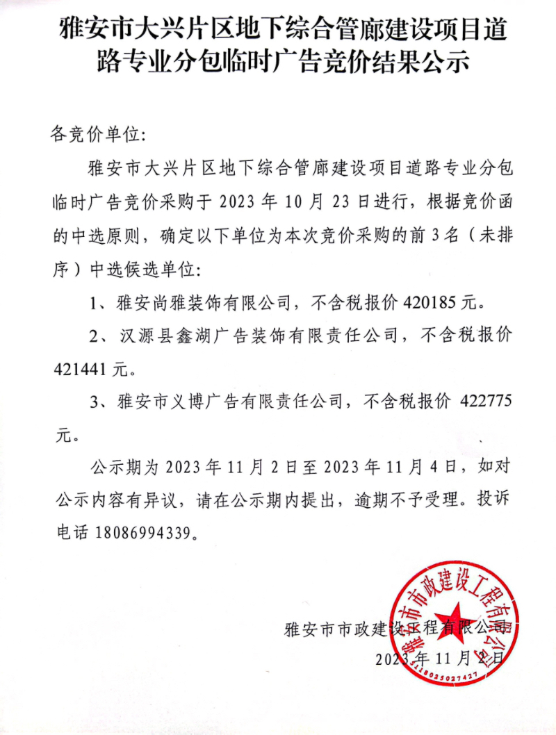 雅安市大興片區(qū)地下綜合管廊建設(shè)項(xiàng)目道路專業(yè)分包臨時(shí)廣告競(jìng)價(jià)結(jié)果公示