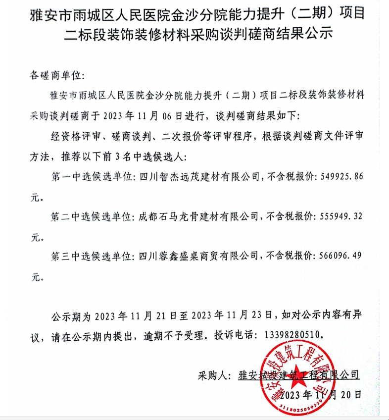 雅安市雨城區(qū)人民醫(yī)院金沙分院能力提升(二期)項(xiàng)目二標(biāo)段裝飾裝修材料采購談判磋商結(jié)果公示