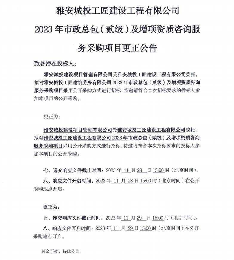 雅安城投工匠建設(shè)工程有限公司2023年市政總包(貳級(jí))及增項(xiàng)資質(zhì)咨詢服務(wù)采購(gòu)項(xiàng)目更正公告