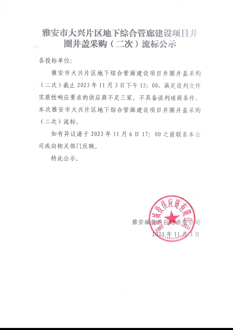 雅安市大興片區(qū)地下綜合管廊建設(shè)項(xiàng)目井圈井蓋采購(gòu)(二次)流標(biāo)公示