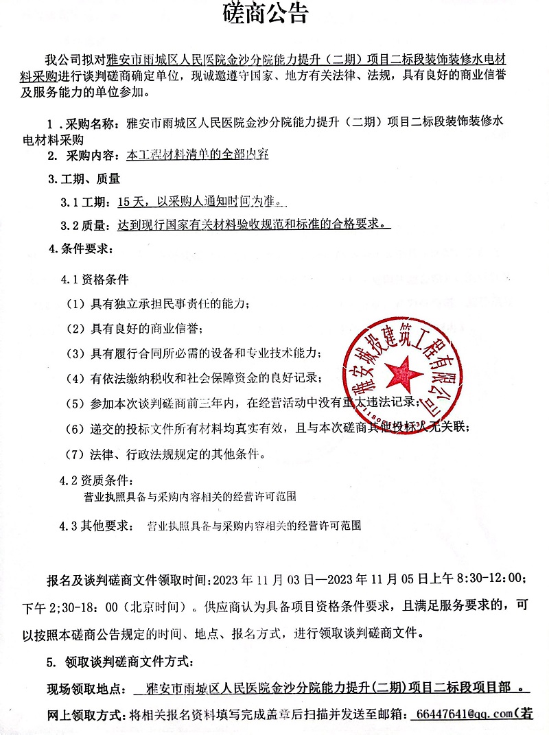 雅安市雨城區(qū)人民醫(yī)院金沙分院能力提升(二期)項(xiàng)目二標(biāo)段裝飾裝修水電材料采購談判磋商公告