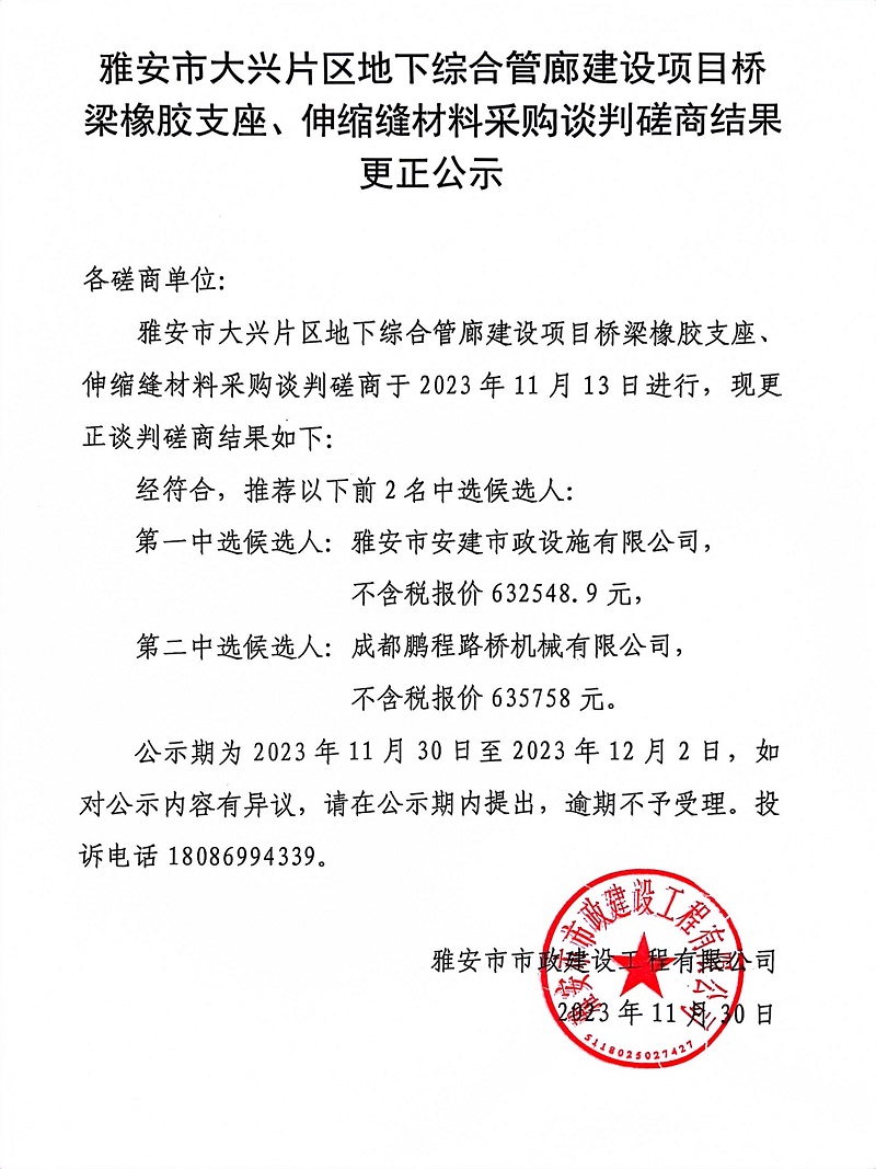 雅安市大興片區(qū)地下綜合管廊建設項目橋梁橡膠支座、伸縮縫材料采購談判磋商結果更正公示