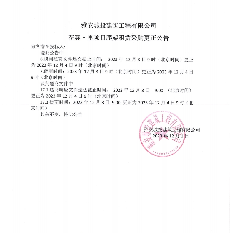 雅安城投建筑工程有限公司花襄·里項(xiàng)目爬架租賃采購更正公告
