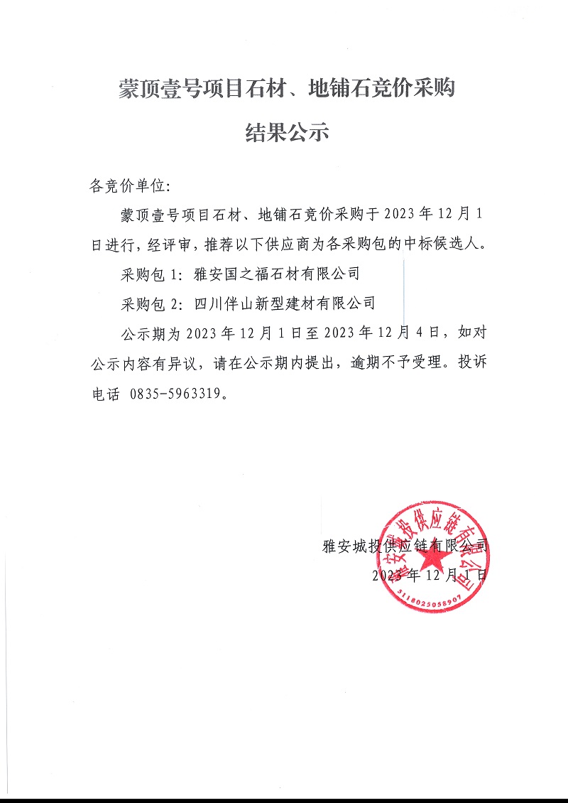 蒙頂壹號(hào)項(xiàng)目石材、地鋪石競(jìng)價(jià)采購(gòu)結(jié)果公示