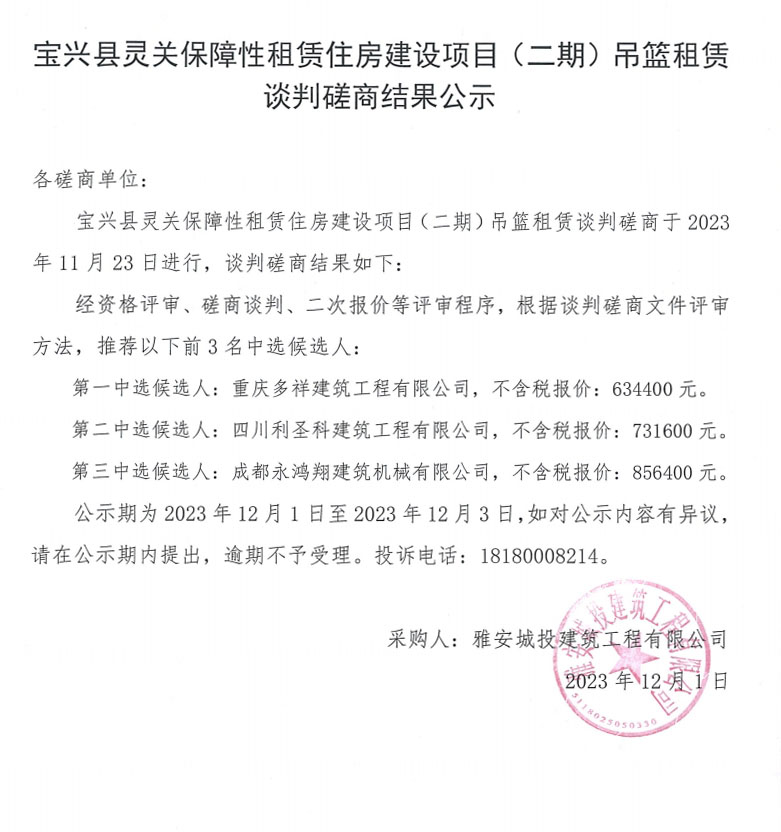 寶興縣靈關(guān)保障性租賃住房建設項目(二期)吊籃租賃談判磋商結(jié)果公示