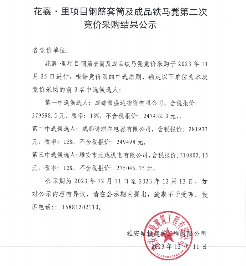 花襄·里項(xiàng)目鋼筋套筒及成品鐵馬凳第二次競價采購結(jié)果公示
