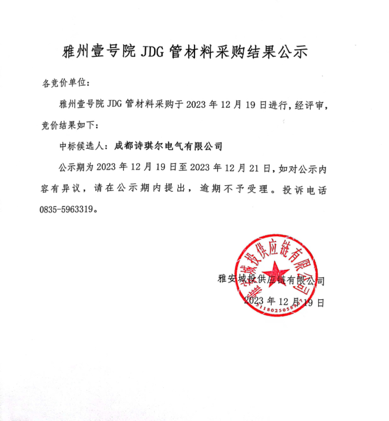 雅州壹號院JDG管材料采購結果公示