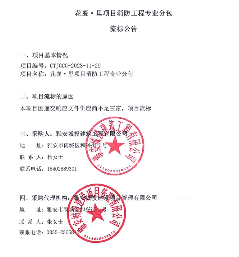 花襄·里項目消防工程專業(yè)分包流標(biāo)公告