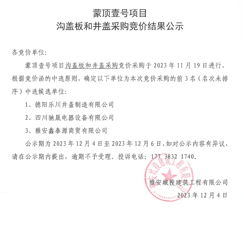 蒙頂壹號(hào)項(xiàng)目溝蓋板和井蓋采購(gòu)競(jìng)價(jià)結(jié)果公示