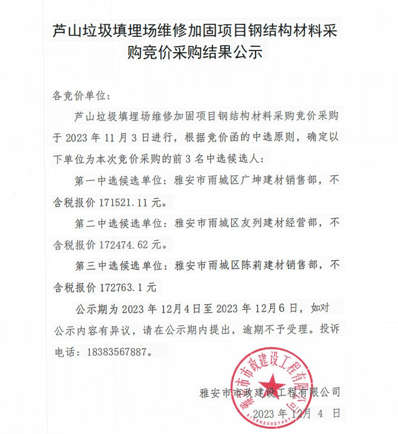 蘆山垃圾填埋場(chǎng)維修加固項(xiàng)目鋼結(jié)構(gòu)材料采購(gòu)競(jìng)價(jià)采購(gòu)結(jié)果公示