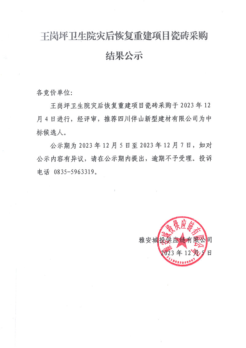 王崗坪衛(wèi)生院災后恢復重建項目瓷磚采購結果公示
