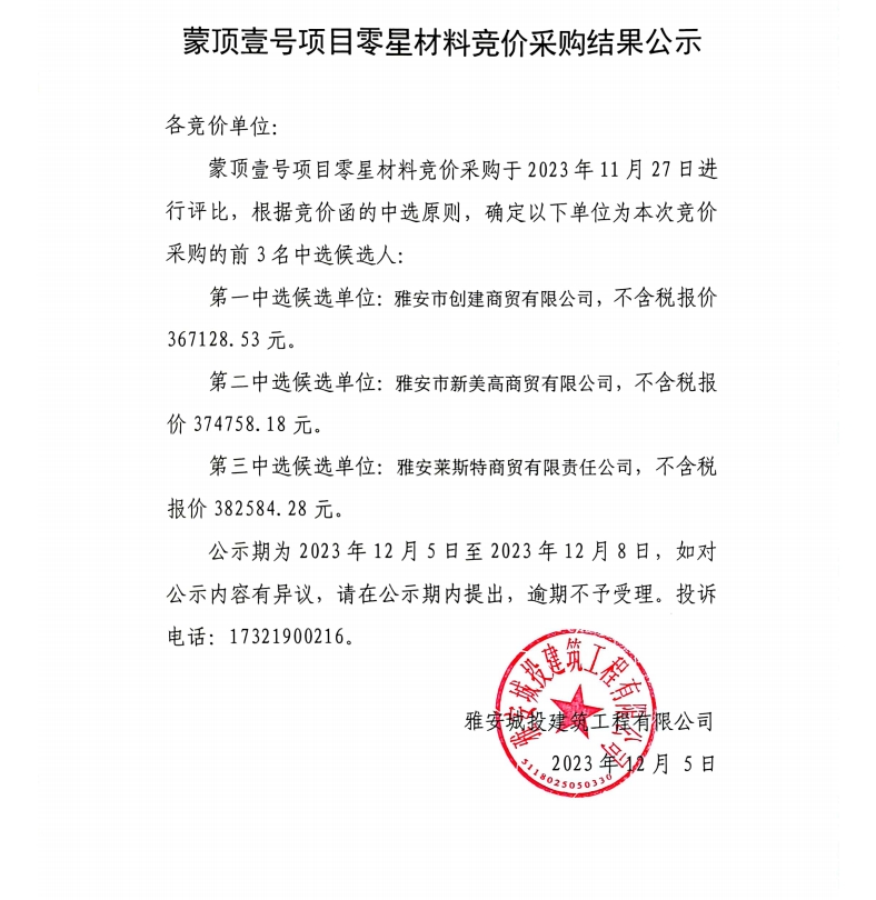 蒙頂壹號(hào)項(xiàng)目零星材料競(jìng)價(jià)采購結(jié)果公示