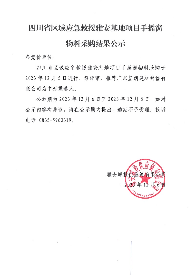 四川省區(qū)域應(yīng)急救援雅安基地項(xiàng)目手搖窗物料采購(gòu)結(jié)果公示