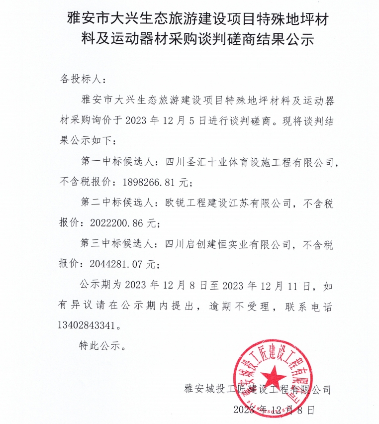 雅安市大興生態(tài)旅游建設(shè)項(xiàng)目特殊地坪材料及運(yùn)動器材采購談判磋商結(jié)果公示