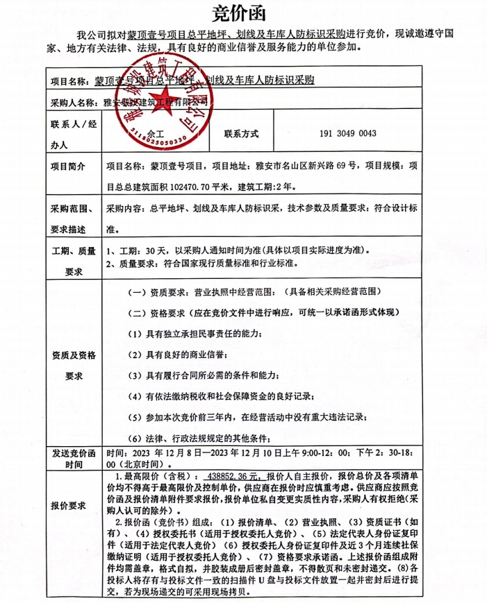 蒙頂壹號項目總平地坪、劃線及車庫人防標識采購競價公告