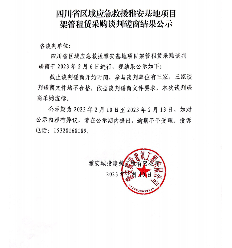 四川省區(qū)域應急救援雅安基地項目架管租賃采購談判磋商結果公示