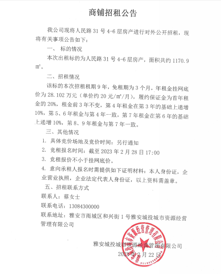 人民路31號(hào)4-6層房產(chǎn)招租公告