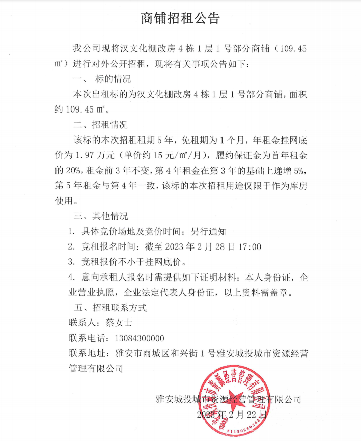 漢文化棚改房4棟1層1號(hào)部分商鋪招租公告