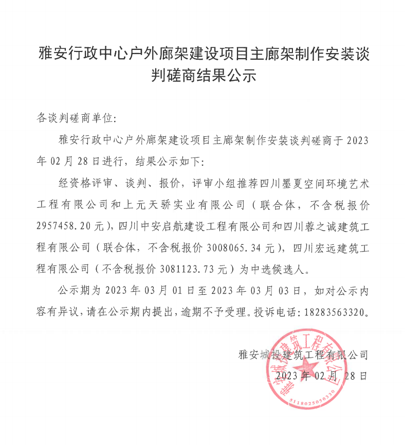雅安行政中心戶外廊架建設項目主廊架制作安裝談判磋商結果公示