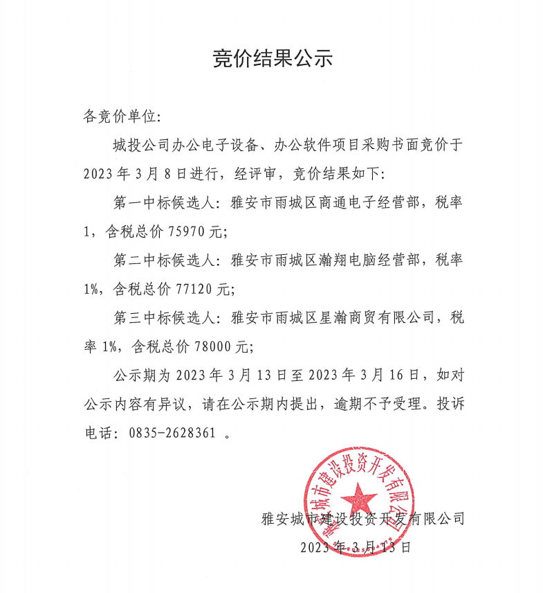 城投公司辦公電子設(shè)備、辦公軟件項(xiàng)目采購競(jìng)價(jià)結(jié)果公示
