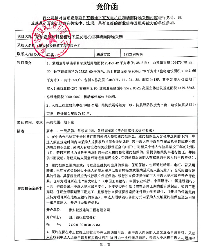 蒙頂壹號項目整套地下室發(fā)電機(jī)組和墻面降噪采購競價公告