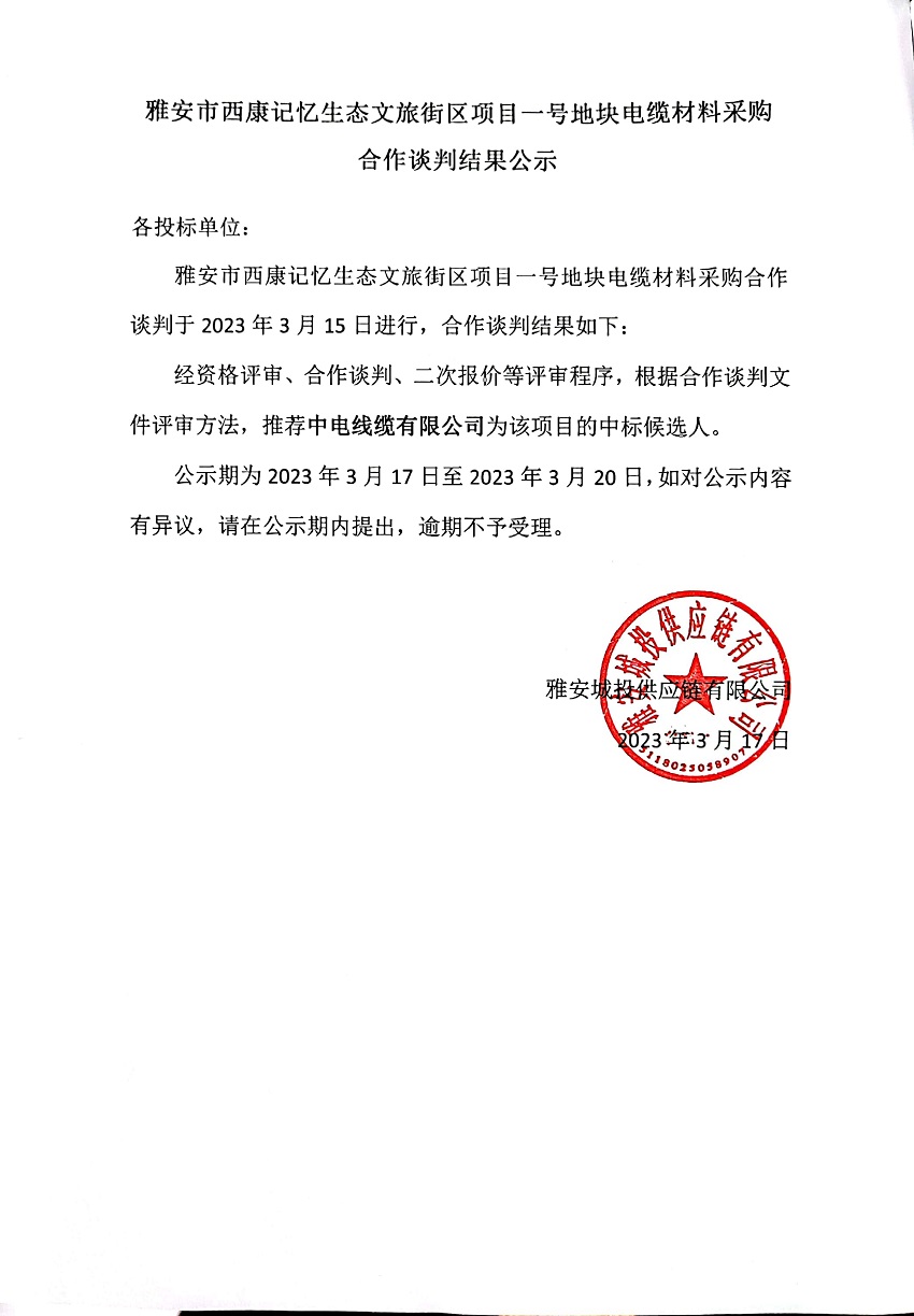 雅安市西康記憶生態(tài)文旅街區(qū)項(xiàng)目一號(hào)地塊電纜材料采購(gòu)合作談判結(jié)果公示