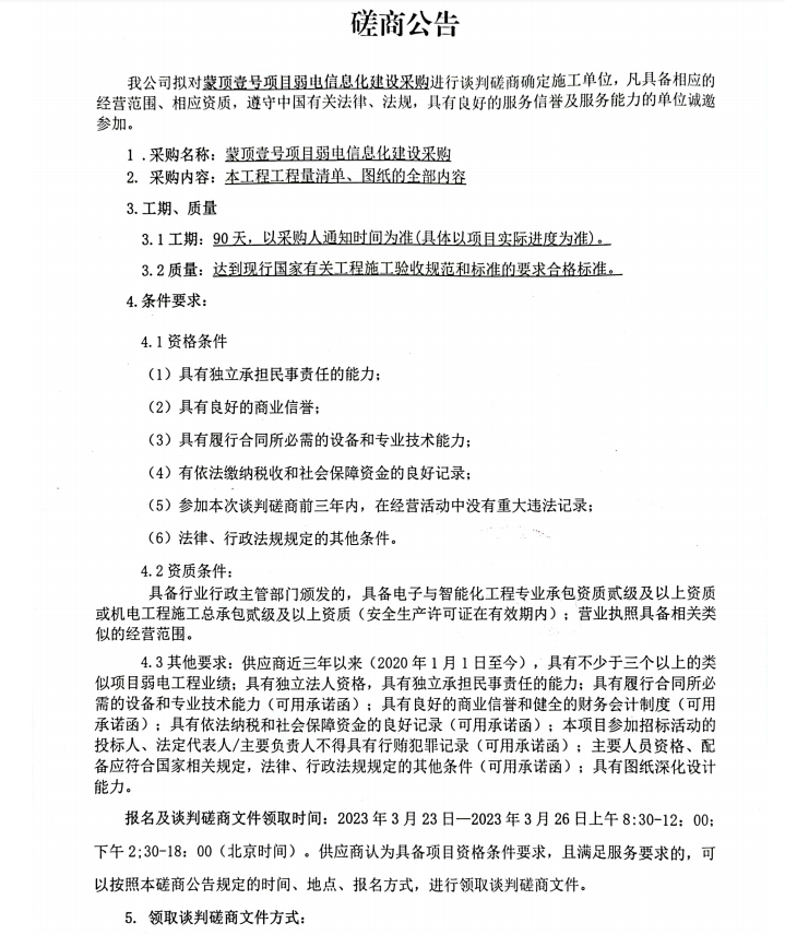 蒙頂壹號項目弱電信息化建設(shè)采購談判磋商公告