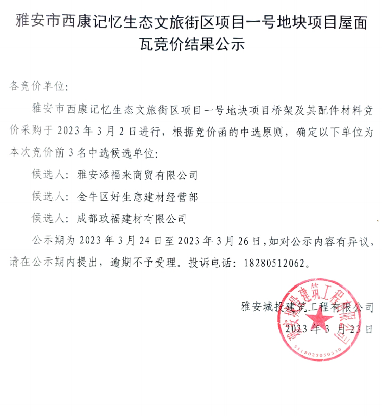雅安市西康記憶生態(tài)文旅街區(qū)項(xiàng)目一號(hào)地塊項(xiàng)目屋面瓦競(jìng)價(jià)結(jié)果公示
