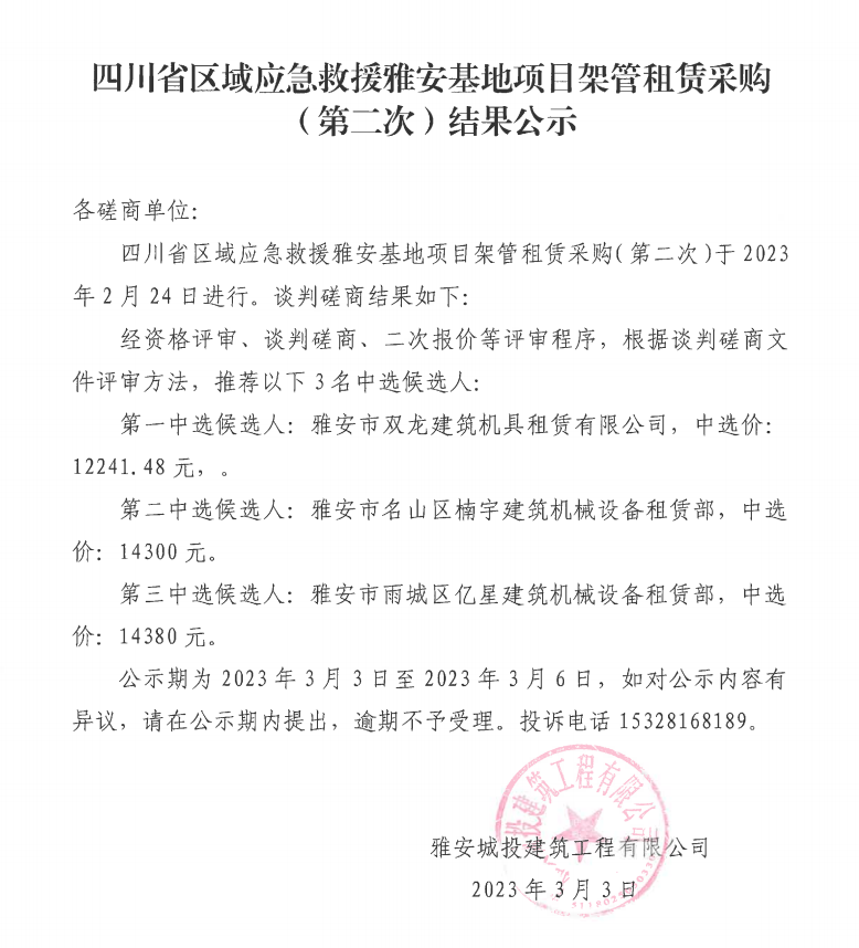 四川省區(qū)域應(yīng)急救援雅安基地項(xiàng)目架管租賃采購(gòu)(第二次)結(jié)果公示