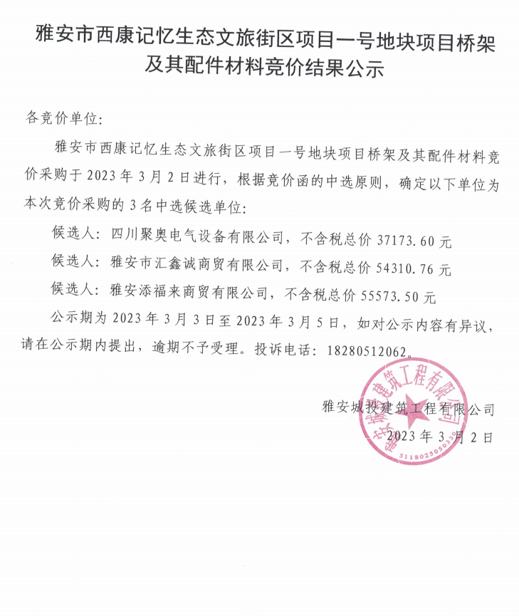 雅安市西康記憶生態(tài)文旅街區(qū)項(xiàng)目一號(hào)地塊項(xiàng)目橋架及其配件材料競(jìng)價(jià)結(jié)果公示